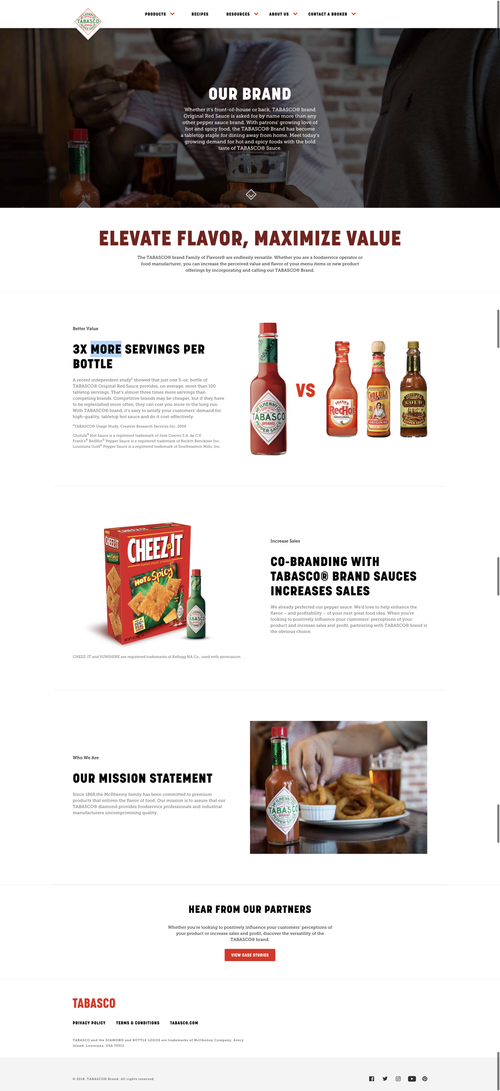 My team was tasked with a full overhaul of TABASCO's three websites – consumer, foodservice, and industrial ingredients. We delivered a sleek consumer experience, here, and a streamlined foodservice/industrial page catering to B2B needs, here.